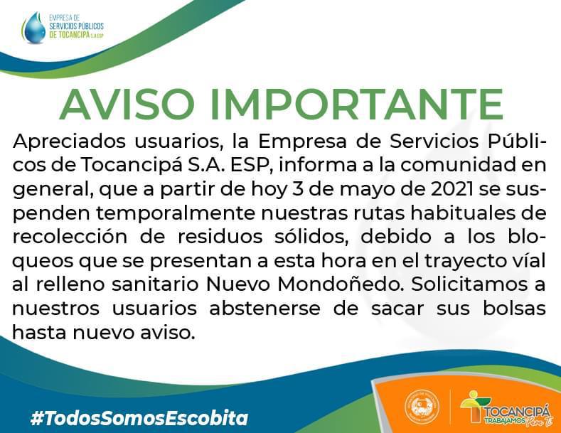 🚮♻#AvisoImportante❗️La Empresa de Servicios Públicos de Tocancipá, informa a la comunidad en general, que a partir de hoy se suspenden temporalmente las rutas de recolección, teniendo en cuenta los bloqueos que se presentan a esta hora en las principales vías del país, lo cual impide el desplazamiento de nuestros vehículos de recolección hasta el relleno sanitario 𝗡𝘂𝗲𝘃𝗼 𝗠𝗼𝗻𝗱𝗼ñ𝗲𝗱𝗼.
