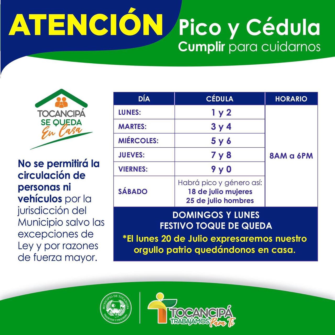 De la manera mas atenta me dirijo a ustedes con el fin de informar y adjuntar los horarios de Pico y Cédula que están vigentes en Tocancipá, de acuerdo a las medidas de aislamiento obligatorio.